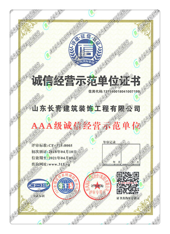 诚信经营示范单位证书